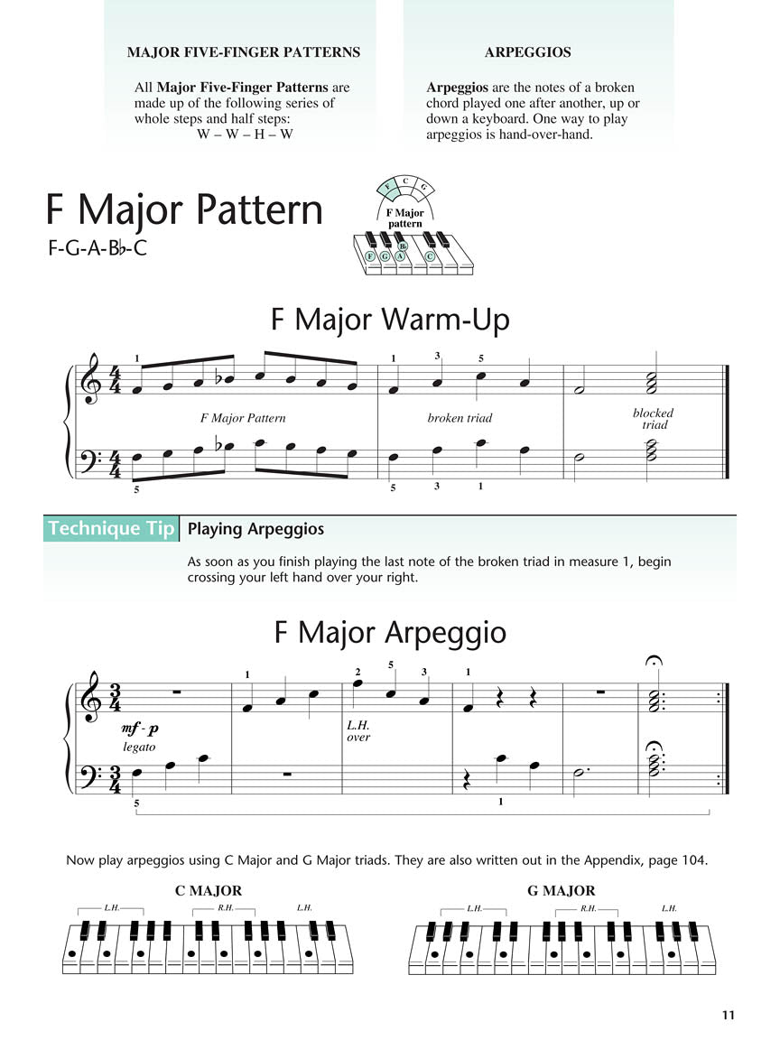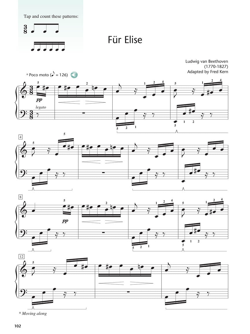 The Adult Piano Method Book 2 begins with a brief review of concepts covered in Book 1, then proceeds step-by-step through 5-finger patterns in C, G, and F – all the way through to major scales in the keys of C, G, and F and their related scales A, E and D minor. Just as in Book 1, the imaginative and entertaining music found throughout Book 2 makes learning a pleasure and a key factor for student success. Great solos emphasize and support the introduction of new concepts in logical, steady sequence. These enticing solos encourage students to move ahead, and they are rewarded with two great arrangements from every adult's “Top Ten” list: “The Entertainer,” and “Für Elise.” Improvs, Quick Licks, Ad Libs, Sight Reading, and Technique Tips sprinkled throughout focus on using new skills and add musical fun along the way. Online audio accompaniments are by Phillip Keveren.
